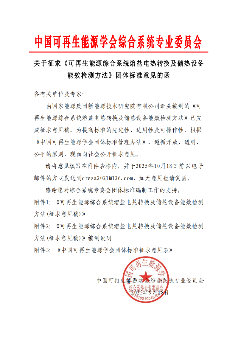 关于征求《可再生能源综合系统熔盐电热转换及储热设备能效检测方法》团体标准...